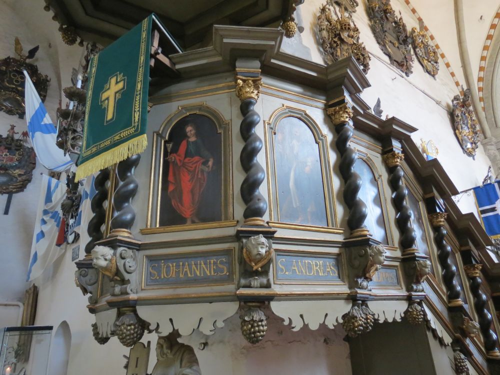 Na kazateľnici sú obrazy apoštolov s titulom svätý.
